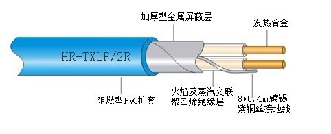 它結(jié)構(gòu)包括有:護套:藍色聚氯乙烯( PVC ); 接地線:鍍錫銅絲; 屏蔽層:鋁箔 + 銅絲; 內(nèi)導(dǎo)體:合金電阻絲+銅絲; 內(nèi)絕緣:交聯(lián)聚乙烯( XLPE );