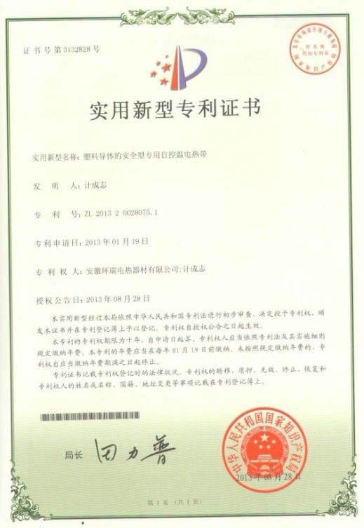 環(huán)瑞自成立研發(fā)小組至科學(xué)技術(shù)中心期間,通過獨(dú)立開發(fā),與合肥工業(yè)大學(xué)建立長(zhǎng)期合作關(guān)系,聘請(qǐng)相關(guān)專業(yè)的技術(shù)專家等模式,投入大量的人力物力。我司以安全,實(shí)用性能為目標(biāo),對(duì)電伴熱帶結(jié)構(gòu)、原材料、生產(chǎn)工藝進(jìn)行創(chuàng)新,最新研發(fā)的“三層共擠自控溫電伴熱帶”“ 塑料導(dǎo)體的安全型自控溫電熱帶”獲得了2項(xiàng)國家專利證書。我司已獲得了5項(xiàng)關(guān)于自限溫伴熱帶的國家專利證書,我司伴熱帶的生產(chǎn)技術(shù)已達(dá)到國內(nèi)先進(jìn)。共計(jì)19項(xiàng)專利。新的專利證書已下達(dá)。