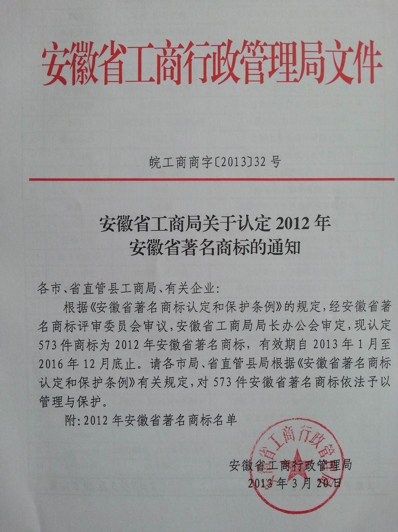 2012年 安徽省著名商標
