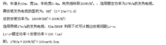 關于車道融雪化冰,為節省出資,不用在車道整個區域鋪設加熱電纜,通常裝置在車輪通過的當地就足夠了??蛇x用單位裝置面積功率為200~250W/㎡,并選用帶地上傳感器的溫控器來操控。