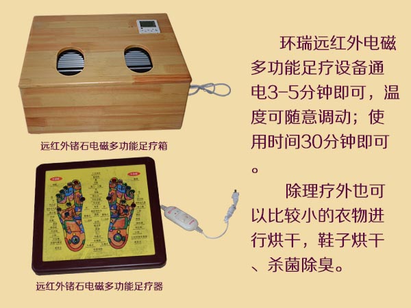 環瑞遠紅外鍺石電磁多功能足療器和遠紅外鍺石電磁多功能足療箱突破了以往足療器采用電動脈沖等原理,讓人們足底有震動感就能理療的假象。環瑞暖腳設備通電后產生17um的遠紅外光波穿過人體真皮組織對足部各個穴位進行效的輻射,促進人體的新陳代謝氣血運行、調節內臟功能、舒通全身經絡,從而達到祛病驅邪、益氣化瘀、滋補元氣的目的經達以按摩治療的效果。