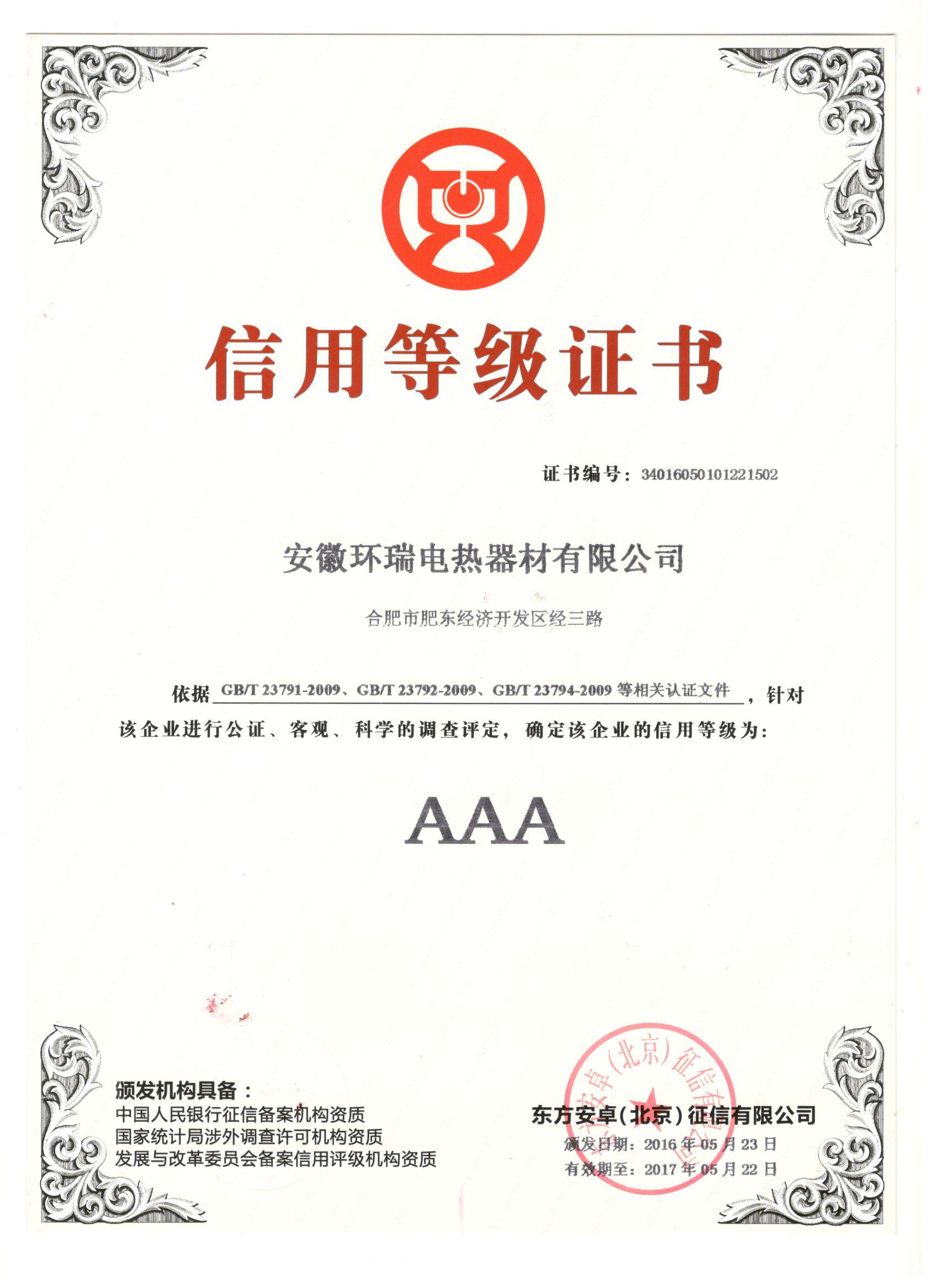 誠(chéng)信是中華民族的傳統(tǒng)美德,誠(chéng)信是一個(gè)企業(yè)立命之根,誠(chéng)信是一個(gè)企業(yè)發(fā)展之本。“AAA”作為一個(gè)誠(chéng)信的標(biāo)志,是對(duì)企業(yè)基本信息、綜合指標(biāo)、經(jīng)營(yíng)發(fā)展、信用記錄等各個(gè)方面行為全方位的評(píng)價(jià),熱烈慶祝安徽環(huán)瑞電熱器材有限公司榮獲 “企業(yè)AAA級(jí)信用等級(jí)證書(shū)”。