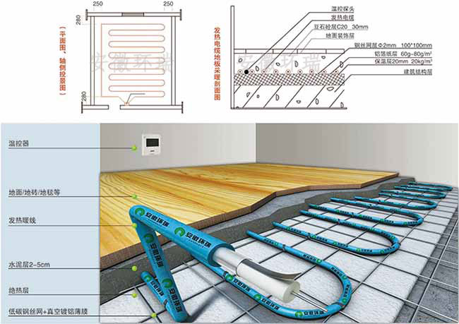 發熱電纜采暖系統是不占用空間的采暖設備,鋪設在地面、墻面和吊頂上。可廣泛應用于家庭、辦公室、賓館、學校、桑拿浴室、瑜珈館等一切需要供暖的場所。不占用任何室內平面空間,使室內空間可以更靈活地布置和安放家具,享受使用更大空間。可分時分室控制,溫度可獨立控制。