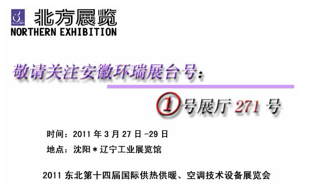 2011年3月27日-29日,安徽環(huán)瑞參加東北國際供熱空調設備展覽會。屆時,我們公司將展出公司的新型技術產(chǎn)品。希望廣大新老客戶來我展臺參觀洽詢,我們的展會人員將以飽滿的情緒接待來至世界各地的每一位關注我們安徽環(huán)瑞的貴客。